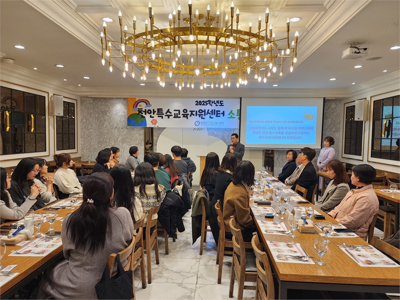 국문 기사◆ 천안교육지원청 특수교육지원센터 성과 정리 충청남도천안교육지원청(교육장 차덕환)은 11월 24일 특수교육지원센터 직원을 대상으로 '2025학년도 특수교육 주요업무 평가 나눔자리'를 개최했다. 이번 행사는 2025학년도 특수교육 전반을 점검하고 직원 의견을 수렴해 2026학년도 운영 방향을 함께 수립하기 위해 마