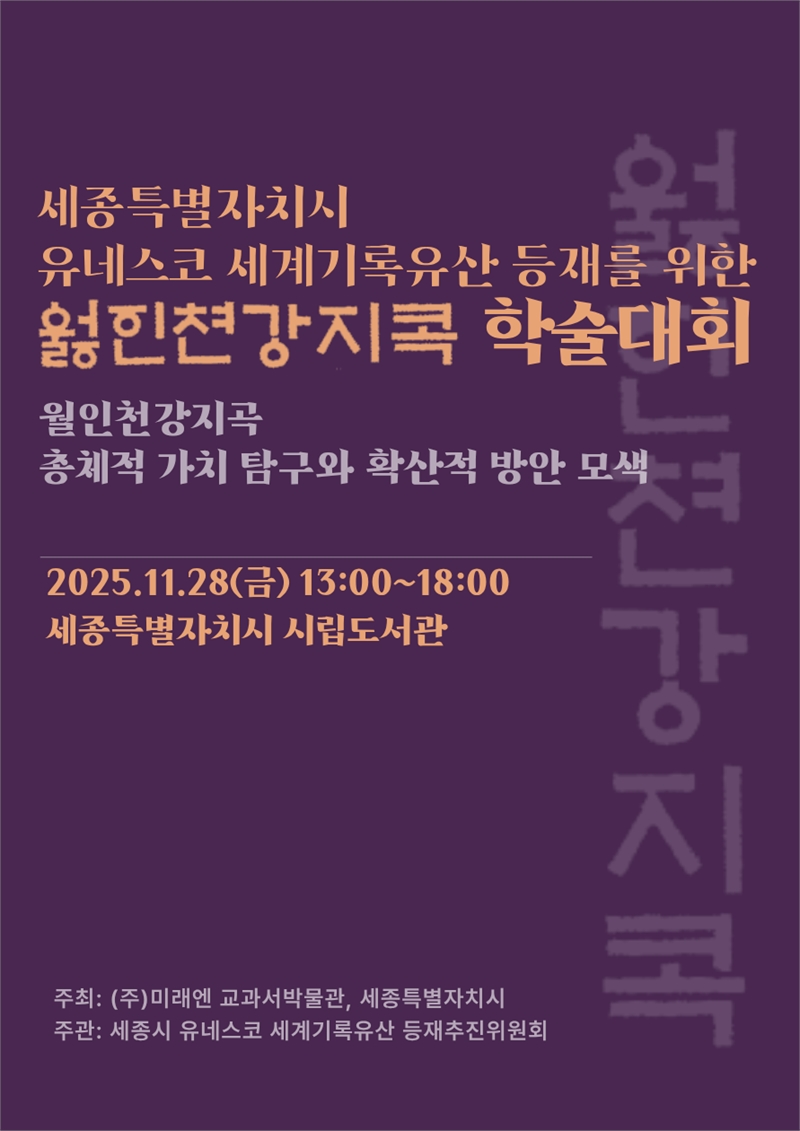 국문 기사◆ 학술대회 개최 배경과 일정 세종시 최민호 시장과 미래엔 교과서박물관이 달리 28일 오후 1시 세종시립도서관에서 '월인천강지곡의 유네스코 세계기록유산 등재'를 위한 학술대회를 개최한다. 교과서박물관과 세종시가 주최하고, 세종시 유네스코 세계기록유산 등재추진위원회가 주관한다. ◆ 월인천강지곡 가치와 학술대회 구성