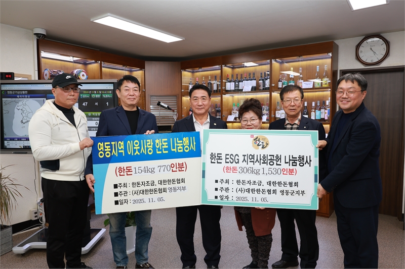 국문 기사 영동군 저소득층 가구에 따뜻한 한끼 제공 예정 (사)대한한돈협회 영동군지부가 5일 영동군청에 한돈 전지 514kg을 기탁했다. 이번 기탁은 한돈 EGS 지역사회공헌 나눔행사로 360kg(400만 원 상당)과 영동지역 이웃사랑 한돈 나눔행사로 154kg(200만 원 상당)을 포함한다. ◆ 매년 ESG 나눔행사 추