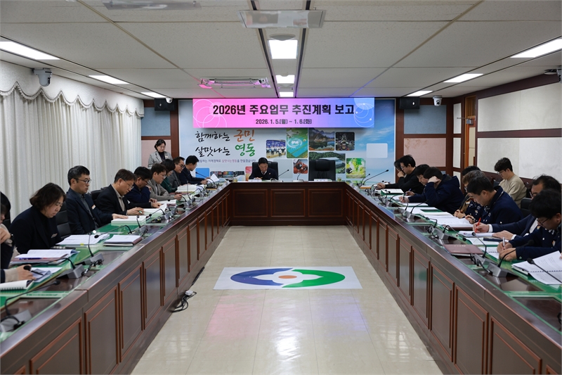 충북 영동군이 2026년 새해 군정운영 방향을 확정했다. 정영철 영동군수는 5일부터 6일까지 이틀간 군청 상황실에서 2026년도 주요업무 추진계획 보고회를 주재했다.◆ 22개 부서·문화관광재단 업무계획 보고 이번 보고회에는 각 부서 팀장들이 참석한 가운데 진행됐다. 22개 전 부서와 영동군 문화관광재단이 부서별 비전, 팀