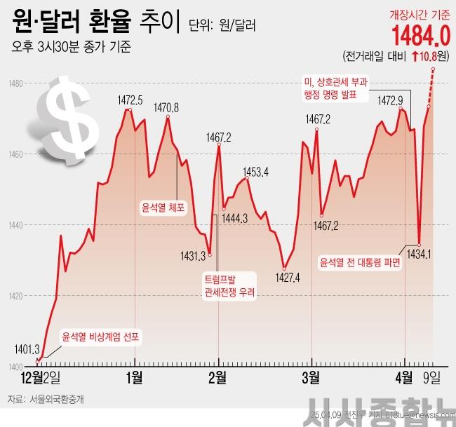 외환시장에서 원·달러 환율은 전 거래일 주간거래 종가(1473.2원)보다 10.8원 오른 1484원에 출발한 9일 서울 중구 하나은행 딜링룸 전광판에 지수가 표시되고 있다. 2025.04.09.