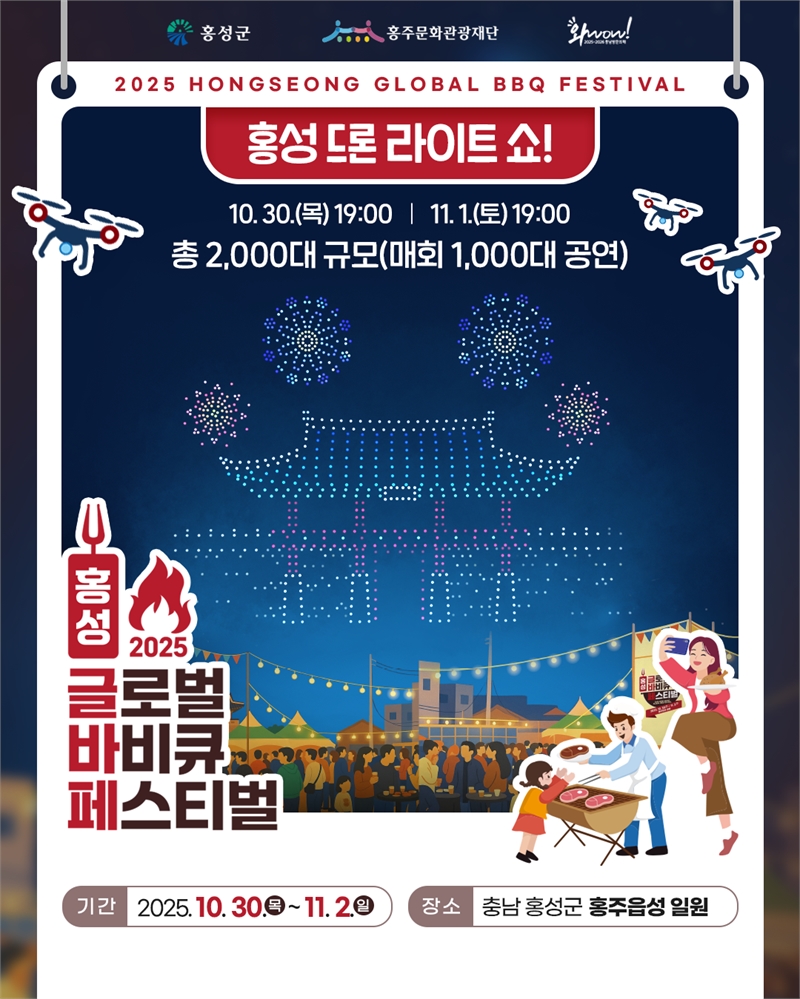 홍성군이 오는 10월 30일과 11월 1일 저녁 7시, ‘2025 홍성 글로벌 바비큐 페스티벌’과 ‘홍성사랑 국화축제’를 배경으로 2,000대 드론라이트 쇼를 선보인다.