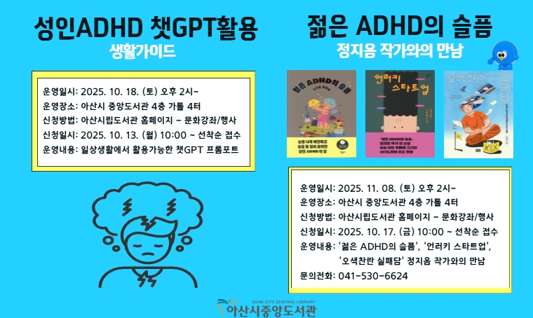 아산시립도서관은 성인 ADHD(주의력결핍 과잉행동장애)에 대한 사회적 인식 개선과 실질적인 생활 지원을 위해 10월과 11월 중앙도서관에서 주제 특강을 운영한다고 13일 밝혔다.