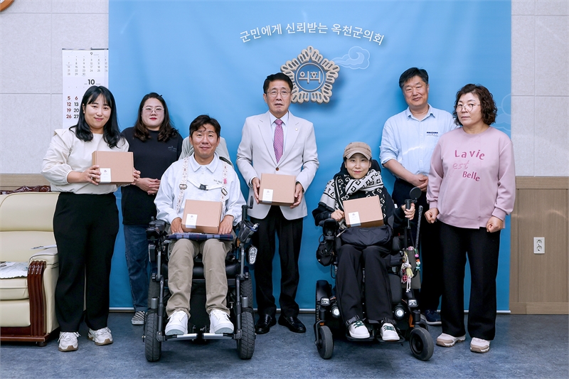 옥천군의회는 14일 의장 집무실에서 충북형 최중증장애인 권리중심일자리 사업 참여자들이 직접 제작한 굿즈를 전달받는 자리를 가졌다.