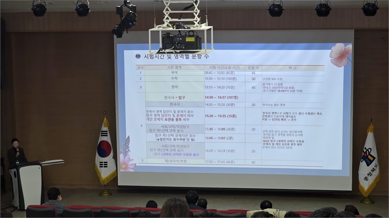 The Chungbuk Office of Education announced precautions for the 2026 College Scholastic Ability Test scheduled for the 13th of next month. The Chungbuk Office of Education held an information session on '2026 CSAT Test-taker Precautions' at the Sarang Hall seminar room on the 28th for officials from five test districts and third-year high school homeroom teachers.