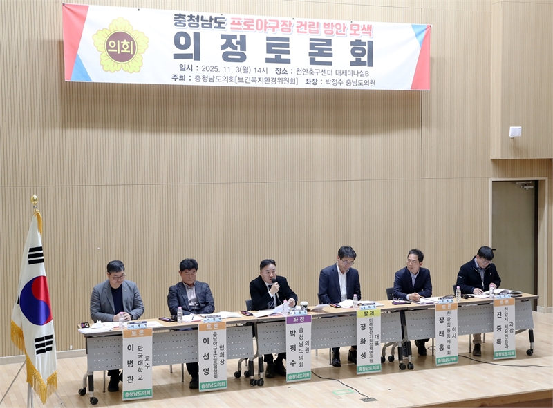 The Chungnam Provincial Council held a policy forum on November 3 at the Cheonan Football Center under the theme of "Exploring Plans for Professional Baseball Stadium Construction in Chungcheongnam-do."