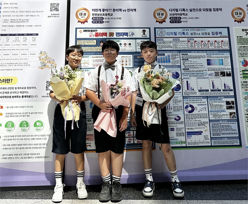 Three sixth-grade students from Sangshin Elementary School in Jincheon, North Chungcheong Province—Lim Do-yoon, Park Tae-yong, and Lee Do-young—claimed first place in the elementary division at the 2024-2025 International Statistics Poster Competition.