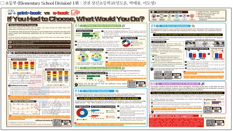 진천상신초 학생팀은 '선택해야 한다면 무엇을 하겠습니까'라는 주제로 포스터를 제작했다. 학생들은 또래들이 일상에서 마주하는 선택 상황을 설문 조사하고 통계적으로 분석했다. 자료 수집부터 분석, 시각화, 결론 도출까지 모든 과정을 직접 기획했다.
