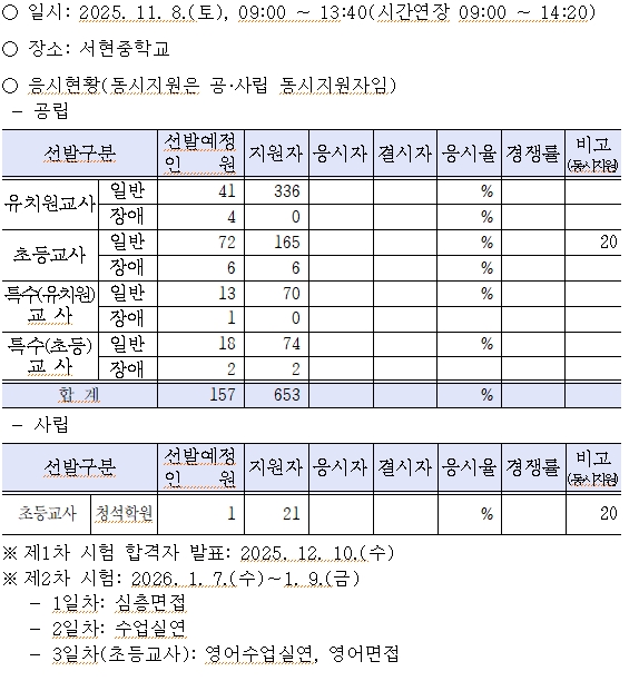1차 합격자 발표는 12월 10일 실시된다. 2차 시험은 2026년 1월 7일부터 9일까지 3일간 진행된다. 공립은 모집인원의 1.5배수를, 사립은 5배수를 1차 시험에서 선발한다. 청석학원이 위탁한 사립 초등교사 1명 선발에는 〇명이 응시했다.