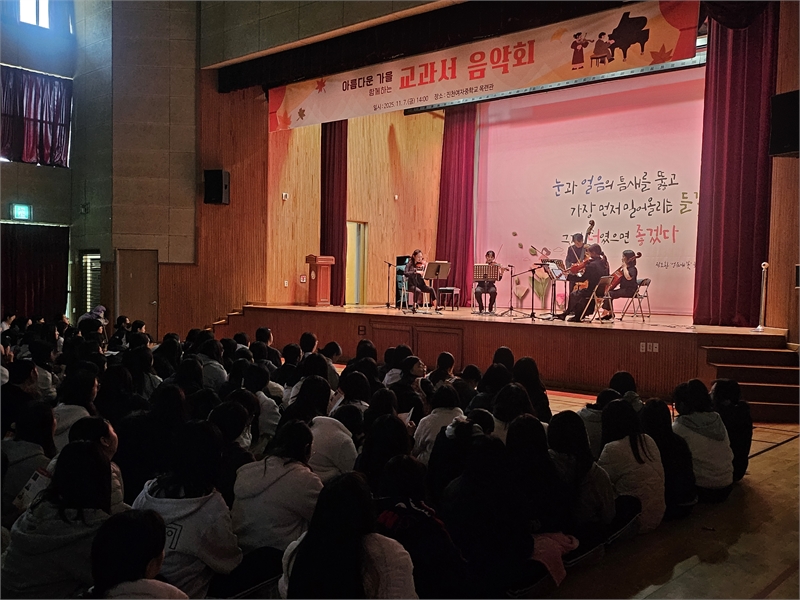 Jincheon Girls' Middle School held the "Beautiful Autumn, Textbook Concert Together" on November 7, 2025. Teacher Lee Ji-hye was in charge of planning. The school invited La Forza Opera Company's orchestra. Students gained musical experience by watching the performance.
