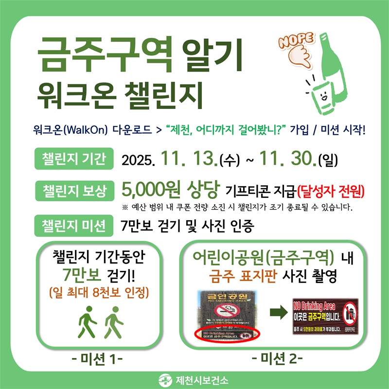 제천시보건소(소장 안순덕)는 11월 30일까지 시민 전체를 대상으로 "금주구역 알기 걷기 챌린지"를 운영한다. 챌린지 미션은 두 가지다. 첫째, 기간 중 7만보 달성(1일 최대 8,000보 인정). 둘째, 제천시 내 어린이공원 방문 후 금주구역 표지판 사진 인증.