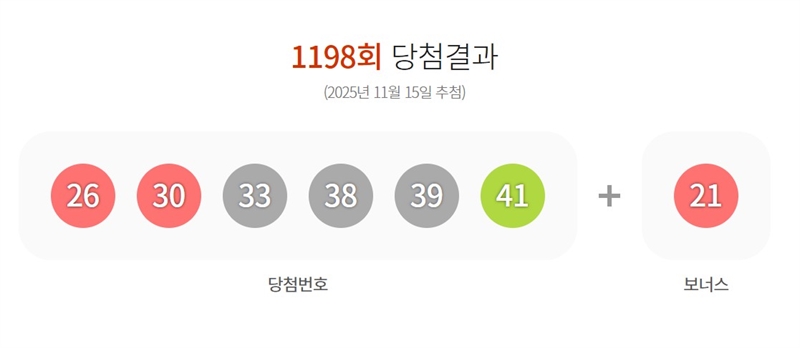 15일 제1198회 동행복권 로또 추첨 결과 '26, 30, 33, 38, 39, 41'이 1등 당첨 번호로 결정됐다. 2등 보너스 번호는 '21'이다.