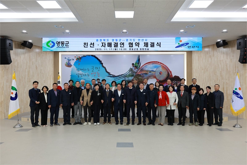 Yeongdong-gun in Chungcheongbuk-do and Ansan City in Gyeonggi-do signed a sister city agreement at Yeongdong County Office on the afternoon of the 17th. County Governor Jeong Yeong-cheol and Mayor Lee Min-geun pledged mutual development and strengthened exchange between the two regions through the agreement ceremony. Officials from both regions, including Ansan City Council Chairman Park Tae-soon and Yeongdong County Council Chairman Shin Hyeon-gwang, attended to celebrate the agreement.