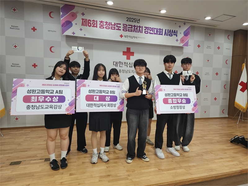 Two teams from Seonghwan High School won the Grand Prize (Presidential Award) and Excellence Award in the high school division at the 6th Chungcheongnam-do First Aid Competition hosted by the Korean Red Cross Chungcheongnam-do Chapter on November 8, 2025. Over 200 students from 50 schools across Chungcheongnam-do participated in the competition, and both Seonghwan High School teams earned awards.