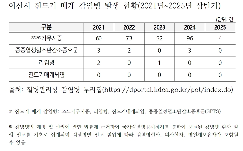 또 의료기관→보건소→역학조사팀으로 이어지는 ‘3단계 신속 대응체계’를 운영해 올해 보고된 모든 의심사례에 대한 역학조사를 100% 완료했다. 조기 차단 중심의 운영으로 감염병 확산 방지 효과를 높임으로써, 최근 5년간 아산지역 SFTS·라임병 발생은 전국 평균 대비 낮은 수준을 유지하고 있다.