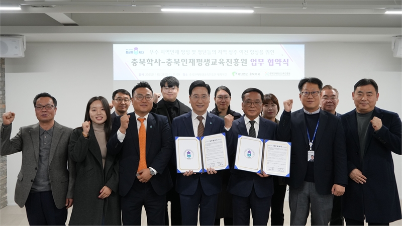 Chungbuk Haksa (Chairman Kim Young-hwan) signed a memorandum of understanding with Chungbuk Talent Lifelong Education Foundation on November 26, targeting "regional talent development and realization of Chungbuk where youth return." The signing ceremony took place at the Chungbuk Talent Lifelong Education Foundation conference room, attended by Yoon Hong-chang, director of Chungbuk Haksa, Yoo Tae-jong, director of Chungbuk Talent Lifelong Education Foundation, executives and staff from both institutions, and a student representative from Chungbuk Haksa's Cheongju facility.