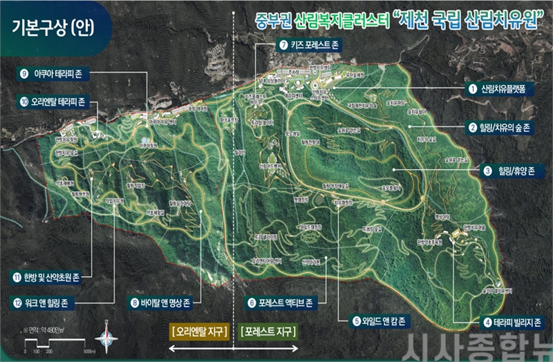 충북도는 포레스트 지구와 오리엔탈 지구 등 2개 지구에 12개 존을 설치한다. 포레스트 지구에는 산림치유플랫폼, 힐링·치유의 숲, 테라피 빌리지 존, 키즈 포레스트 존 등 7개 존을 조성한다. 오리엔탈 지구에는 아쿠아테라피 존, 오리엔탈 테라피 존, 한방 및 산약초원 존 등 5개 존을 조성한다. 주요 시설은 산림치유센터, 한방·치유체험장, 한방약초숲길, 아쿠아테라피 존 등이다. 산림청이 운영기관을 맡는다. 제천 한방자연치유센터와 유기적으로 연계해 통합 국립산림치유원을 조성한다.