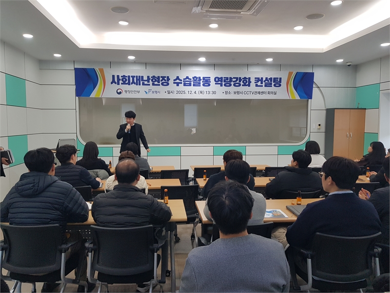 Boryeong City held a 'Social Disaster Site Recovery Capacity Building Consulting' session at the CCTV Control Center conference room on December 4. The Ministry of the Interior and Safety supervised the program. The training targeted 35 officials from 21 departments responsible for social disaster recovery, including crowd crush incidents and building fires.