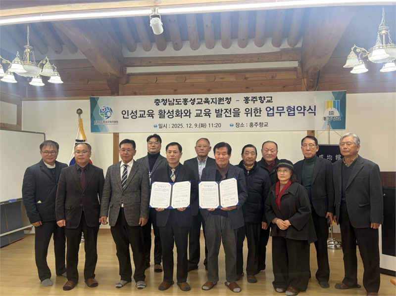 충청남도 홍성교육지원청(교육장 임광섭)과 홍주향교(전교 이철학)가 12월 9일 오전 11시 홍주향교 예절관에서 학생 인성교육 활성화를 위한 업무협약을 체결했다. 협약식에는 임광섭 교육장과 이철학 전교를 비롯해 양 기관 관계자 10명이 참석했다. 두 기관은 학생들의 올바른 인성 함양과 건전한 가치관 형성을 위해 다양한 프로그램과 활동을 공동으로 추진하기로 약속했다.