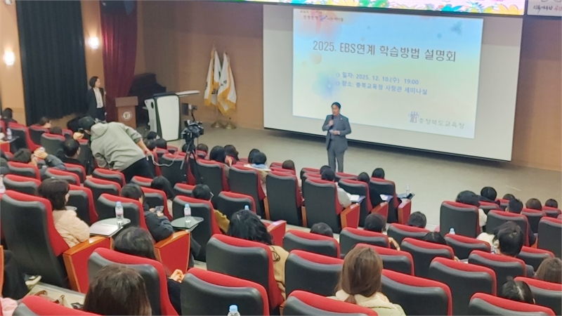 충청북도교육청(교육감 윤건영)이 10일 오후 7시 충북교육청 사랑관에서 예비 고3학생과 학부모, 교원 약 200명을 대상으로 EBS 연계 학습방법 설명회를 개최했다. EBS 강사 이하영, 김성길이 수학 영역 수능 준비 방법, 내신 대비 학습법, 2027 대입지원 방향을 설명했다.