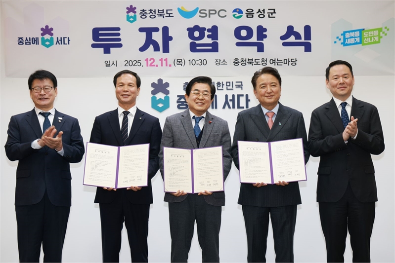 Chungcheongbuk-do Province, Eumseong County, and SPC Group executed an investment agreement on December 11 at the provincial government briefing room. Governor Kim Young-hwan, County Mayor Cho Byung-ok, and SPC Group Vice Chairman Huh Jin-soo signed the agreement. SPC Group will establish an integrated production center within Eumseong Human Smart Valley.