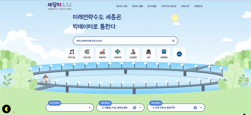 세종특별자치시(시장 최민호)가 12일 '세종시 빅데이터 개방형 플랫폼'의 명칭을 '세담터(세종을 담는 데이터)'로 변경했다. 메인화면과 메뉴 구성을 이용자 중심으로 전면 개편하고 가독성·접근성을 높였다. '세담터'는 2022년 12월 시민이 세종시 데이터를 쉽게 접하고 활용하는 누리집으로 구축됐다. 시는 메인화면에 세종을 대표하는 이응다리를 디자인 요소로 구현해 시의 정체성을 반영했다.