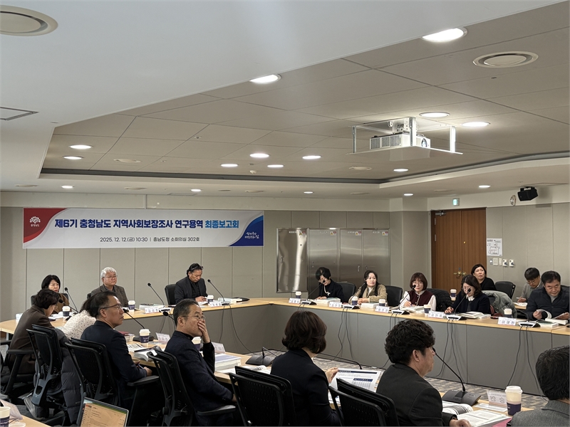 충남도는 12월 12일 도청 소회의실에서 '제6기(2027~2030) 지역사회보장조사 연구용역 최종보고회'를 개최했다. 지역사회보장계획 수립의 근거가 되는 주민의 복지 욕구, 생활 실태, 사회보장 서비스 이용 현황 등을 체계적으로 파악하기 위해 진행한 연구용역의 최종 결과를 공유하고 향후 정책 방향을 논의하기 위함이다.