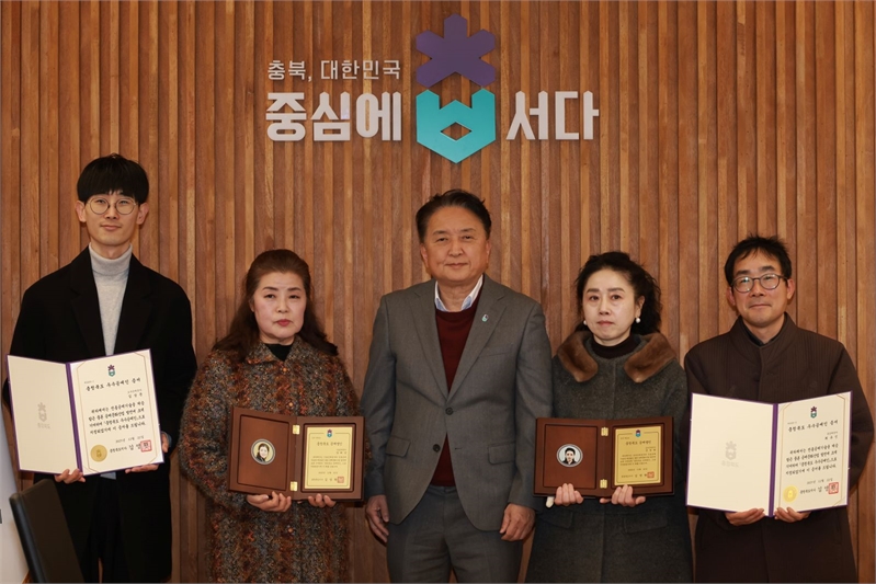 충청북도는 22일 충북도청 여는 마당에서 '충청북도 공예명인' 2명과 '충청북도 우수공예인' 2명에게 지정패와 증서를 전달했다. 올해 공예명인은 금속공예 분야 '달과 6펜스' 문정현 대표와 지호공예 분야 '손끝사랑' 양혜영 대표다. 문정현 대표는 16년간, 양혜영 대표는 33년간 각 분야 발전에 기여했다.