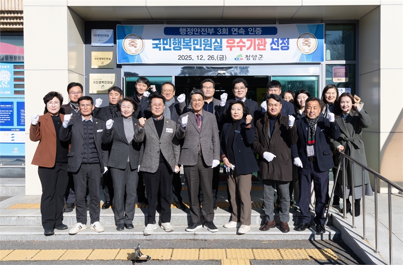 청양군은 26일 행정안전부 주관 국민행복민원실 우수기관 인증을 3회 연속으로 획득했음을 기념하는 현판 제막식을 개최했다. 김돈곤 군수를 포함한 공무원 20명이 참석한 행사는 청양군이 민원서비스 분야 선도 지자체로서 역할을 지속하고 있음을 보여주는 자리였다. 군은 2019년, 2022년, 2025년 3차례 인증을 받았으며 행정안전부로부터 우수기관 표창을 수상했다. 재인증 유효기간은 2025년 12월 1일부터 2028년 12월 31일까지 3년간 유효하다.