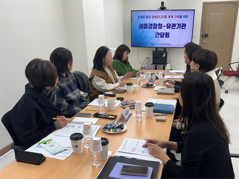 세종경찰청(청장 한원호)이 관계성 범죄 공동모니터링 체계를 본격화했다. 세종경찰청과 세종자치경찰위원회(위원장 남택화)는 12월 26일 세종1366센터, 종촌가정·성폭력통합상담소, 세종YWCA성인권상담센터와 간담회를 열었다. 세종시 관계성 범죄 공동대응체계 구축 조례가 12월 15일 제정·시행됨에 따른 협력 방안을 논의했다.