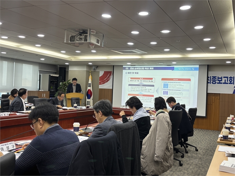 The Chungcheongnam-do Provincial Government held a final report meeting on December 29 to establish the "Second Materials, Parts and Equipment Industry Development Basic Plan (2026-2028)" at the provincial government's conference room. The meeting was attended by approximately 20 participants including Vice Governor Jeon Hyung-sik, related provincial officials, members of the Materials, Parts and Equipment Industry Committee, and representatives from Chungnam Techno Park. The meeting proceeded with final reports, agenda reviews, and consultations.