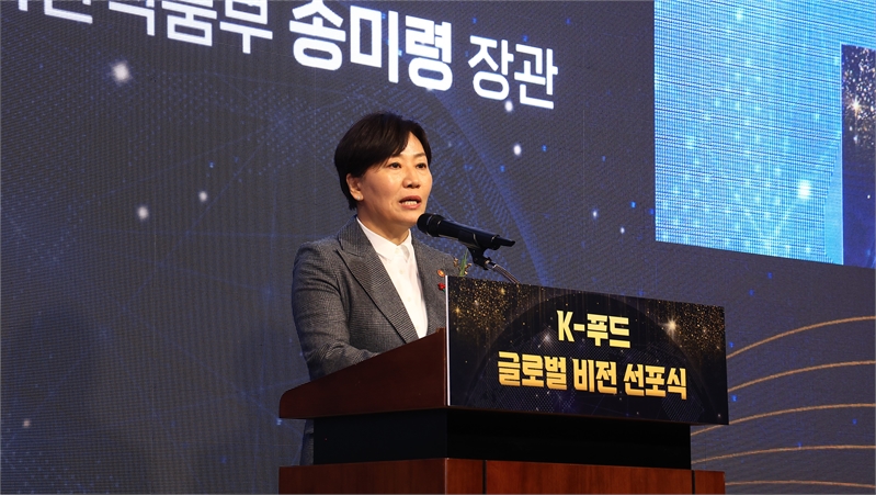 농림축산식품부는 지난 23일 서울 서초구 aT센터에서 'K-푸드 글로벌 비전 선포식'을 열었다. 사진은 송미령 농식품부 장관이 이날 선포식에서 발언을 하고 있는 모습. 사진/농식품부 제공 2025.12.23.