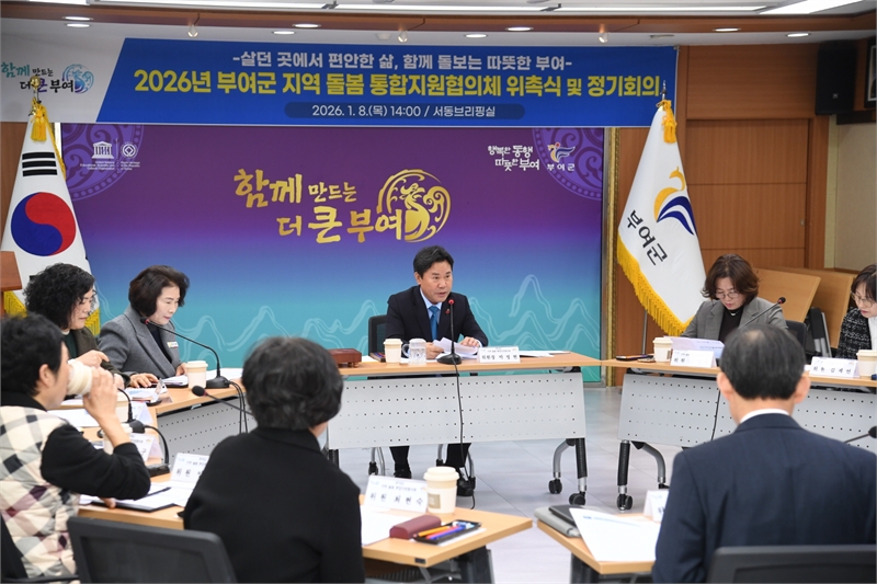 부여군이 8일 군청 서동브리핑실에서 '부여군 지역 돌봄 통합지원협의체' 위원 위촉식과 정기회의를 개최했다. 이번 협의체는 2026년 3월 시행 예정인 돌봄통합지원법에 선제 대응하기 위해 구성됐다. 부여군은 협의체를 통해 지역 특색에 맞는 '부여형 통합 돌봄' 기반을 마련한다.