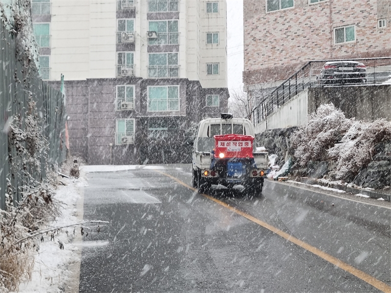 The city began snow removal operations at 2:30 a.m. on the 10th by assembling 18 road department personnel, 36 snow removal vehicles, and 2 excavators at the Geumneung-dong and Seochungju stockyards. Public officials and local autonomous disaster prevention teams in each township and neighborhood collaborated to intensively spread snow removal agents on alleys and back roads. As of 9 p.m. on the 10th, the average snowfall was 3.1cm, with Suanbo recording 7.5cm, Chilgeum-dong 4.6cm, and Daesowon 3.3cm. The city continued snow removal operations until early morning on the 11th even after the heavy snow advisory was lifted at 11:20 p.m.