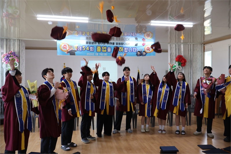 Jeongsu Middle School in Yeongdong held its 54th graduation ceremony on January 9 at the school auditorium. On this day, 73 graduates wore graduation gowns instead of school uniforms and wore stoles. Principal Yun Mi-seon presented diplomas to graduates and personally placed stoles around their necks. The stoles were engraved with each graduate's name, admission date, and graduation date. Jeongsu Middle School has continued this graduation tradition since the 49th graduation ceremony in 2021.