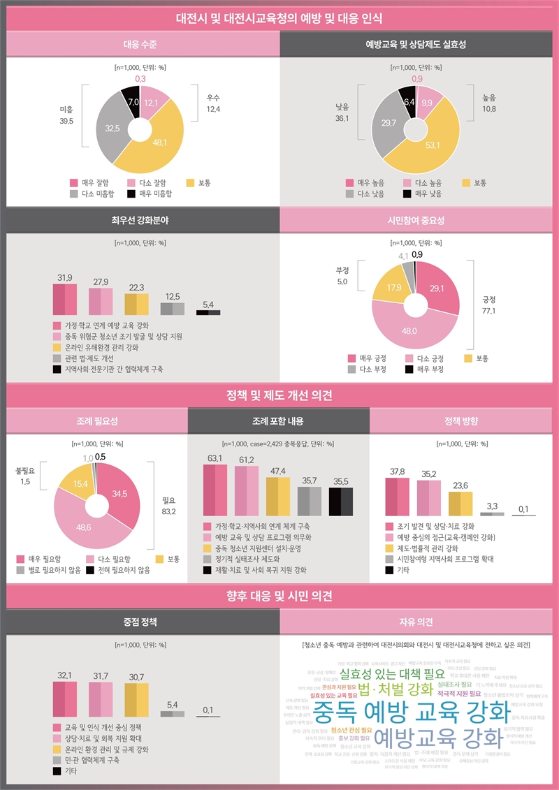 대전시와 대전시교육청의 청소년 중독 예방·대응 수준에 대해 '미흡하다'는 응답이 39.5%로 '우수하다'(12.4%)보다 3배 이상 높았다. 학교 및 지역사회 예방교육·상담제도의 실효성에 대해 '보통' 또는 '낮음'이라는 응답이 89.2%에 달했다.
