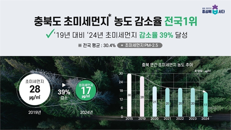 충청북도 초미세먼지 연평균 농도는 2019년 28㎍/㎥에서 2024년 17㎍/㎥로 39% 감소했다.