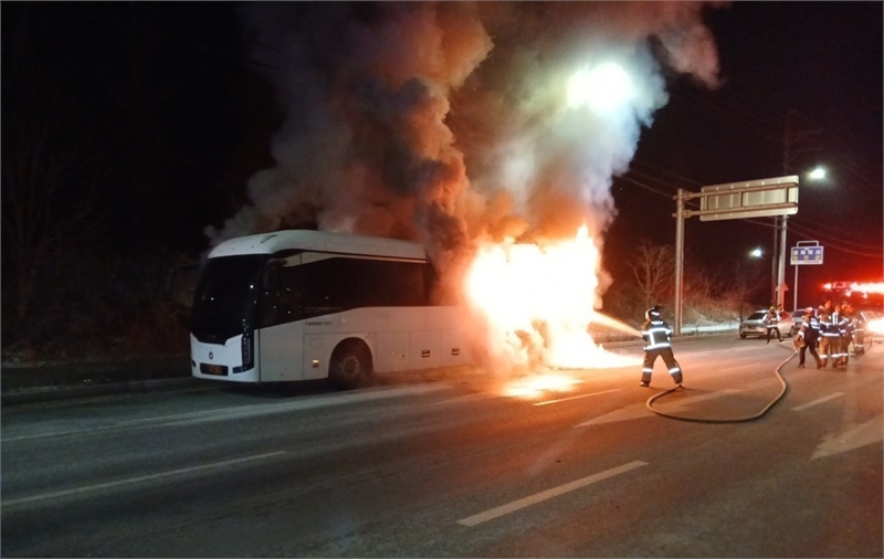 At about 5:14 a.m. on the 12th, a fire broke out on a 47-seat commuter bus parked along a roadside in Jibuk-dong, Sangdang-gu, Cheongju, North Chungcheong Province. The blaze burned the entire bus and caused an estimated 130 million won in property damage, according to fire authorities.