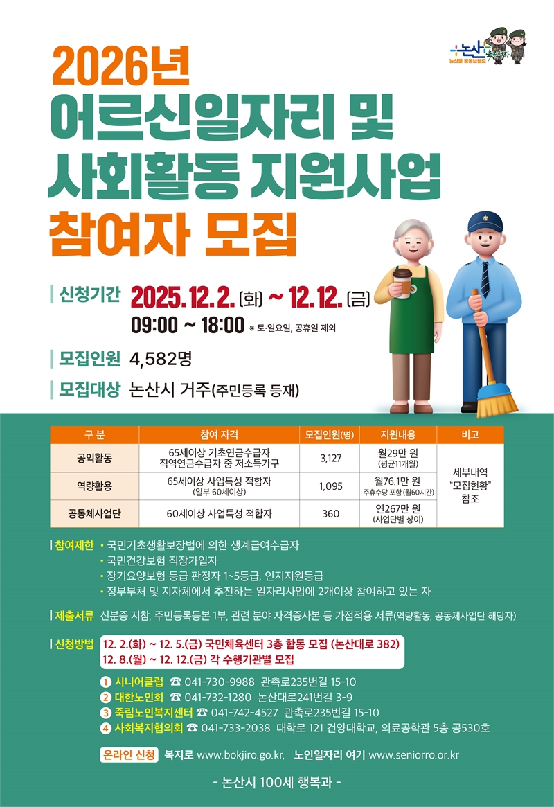 국문 기사◆ 모집 규모 및 일정 논산시(시장 백성현)는 2026년도 어르신일자리 및 사회활동 지원사업 참여자 4,582명을 12월 2일부터 12일까지 모집한다. 올해 4,278명보다 304명 증가한 규모다. ◆ 사업 유형별 모집 현황 모집 인원은 지역사회 환경개선사업 등 공익형 3,127명, 보육시설 지원 등 역량활용형