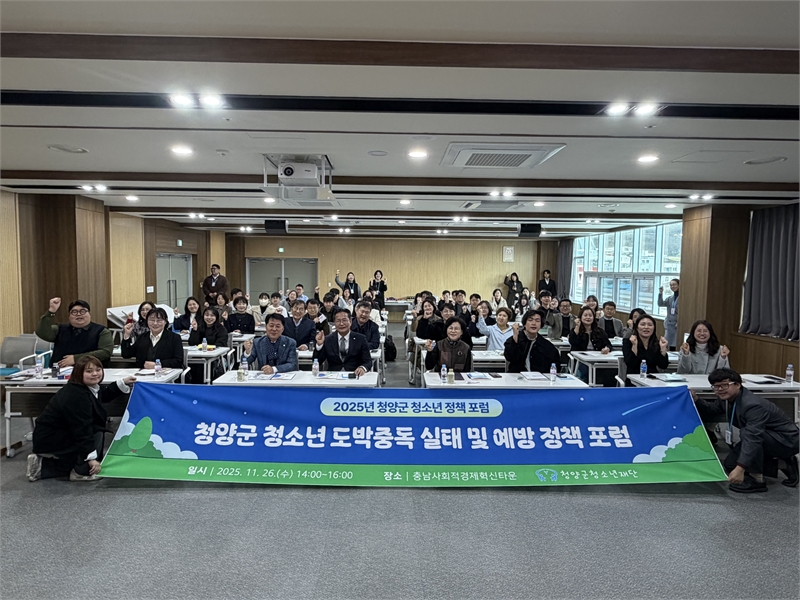 국문 기시청양군 김돈곤 군수가 청소년 도박 문제의 실태를 진단하고 예방·조기 개입 정책을 수립하기 위한 포럼을 개최했다. 청양군청소년재단 윤여권 이사장과 청양군청소년상담복지센터 박시연 센터장은 지난 26일 충남사회적경제혁신타운에서 '2025년 청양군 청소년 도박문제 실태 및 예방 정책 포럼'을 열었다. 청소년·유관 기관·