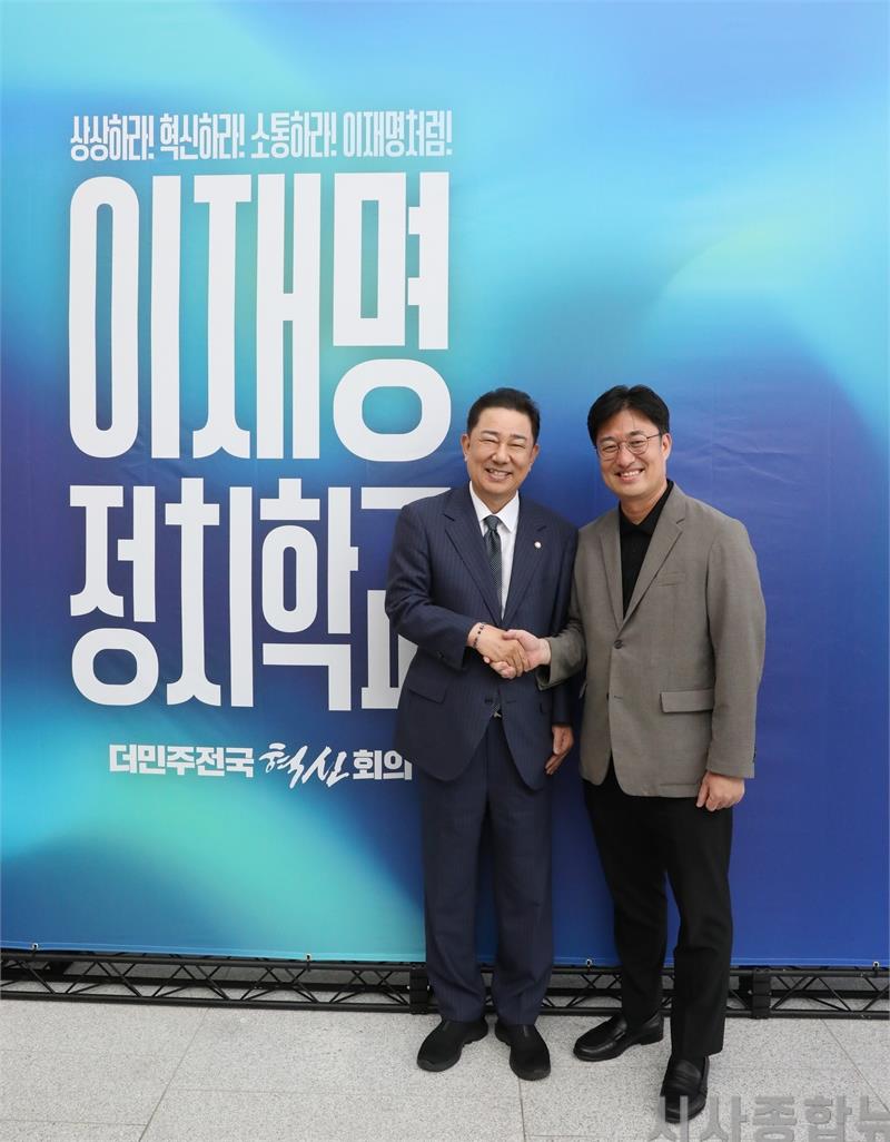 Photo of Prospective Candidate Kim Myeong-sik for Jincheon County Governor taken with Democratic Party Floor Leader Kim Byung-ki. Photo/Kim Myeong-sik