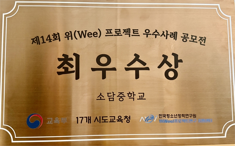 Sodam Middle School in Sejong was selected as the National Excellence School at the 14th Wee Project Best Practices Competition and held a plaque ceremony on December 9th. The establishment of a student-customized support system and collaboration of the educational community received high evaluation.